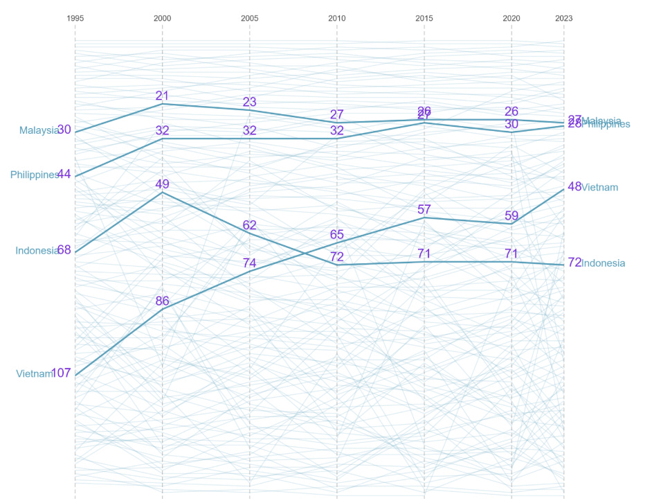 Harvard’s Economic Complexity Index (ECI) tells an uncomfortable truth. Despite spending more than a decade investing in sending people to school abroad, Indonesia’s economic complexity remains at the same rank as it did in 2010.
