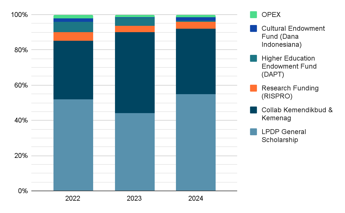 We could first look at LPDP’s past spending. Each year, they spend more than 80 percent of their budget on scholarship programs, hitting an all-time high of 92 percent in 2024.
