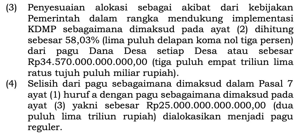 In February, the Finance Ministry issued a Finance Ministerial Regulation (PMK) No. 7/2026, mandating that 58 percent of the national village fund allocation, some Rp 34.57 trillion out of Rp 60.57 trillion, go toward KMP. What remains for roads, sanitation, schools, and clean water across 74,000 villages is about Rp 25 trillion.
