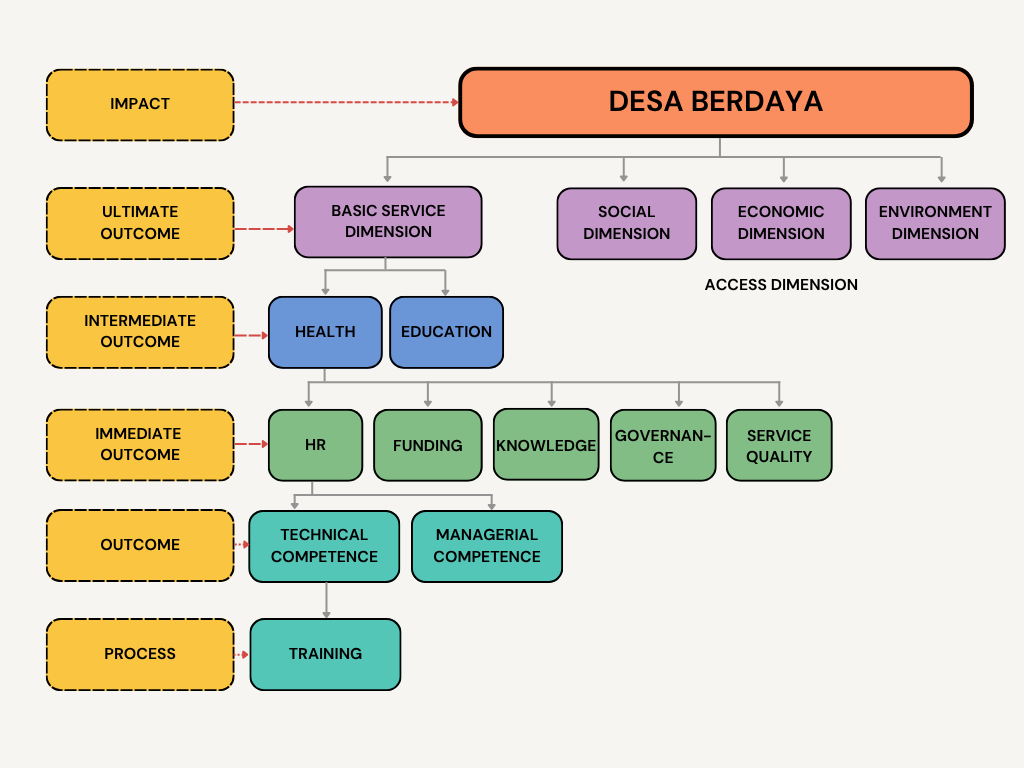 At this forum, data was collected on 52 development partners also working at the village level. So what came next? Didik S. Mulyono, a planning consultant from Yogyakarta, offered us very useful input. He suggested forming a logic model, a logical framework serving as a roadmap that explains the relationships between processes, outputs, and development impact. This framework can guide all parties in understanding how their contributions connect to the success of Empowered Villages.