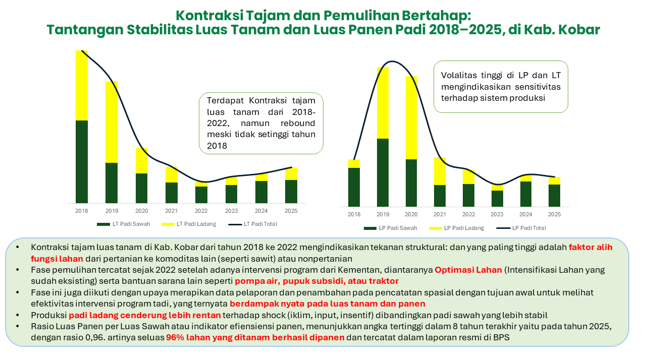 Kontraksi tajam sebenarnya sudah diprediksi. Tekanan struktural di mana faktor alih fungsi lahan dari sawah ke komoditas non-padi (terutama sawit) menjadi ancaman serius. Data dari Dinas Pertanian Kabupaten Kotawaringin Barat menunjukkan luas baku sawah terus menurun hingga 1.621 hektar pada tahun 2024.