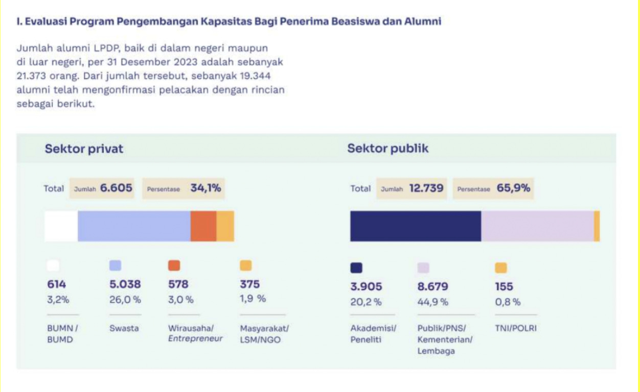 In fact, 2023 was the first year that LPDP Annual Reports included a breakdown of alumni results—albeit briefly. In previous years, this portion of the report had been filled with a list of around ten standout alumni, highlighting their career paths as representative of the LPDP program’s success, with limited empirical data.