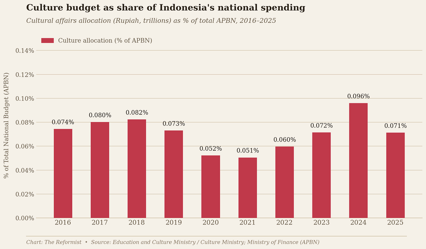 Over the past decade, and likely for long before that, cultural affairs have consistently received less than 0.1 percent of Indonesia’s national budget. Even after the Directorate General for Culture was elevated into a standalone ministry in 2024, its fiscal standing has stagnated.